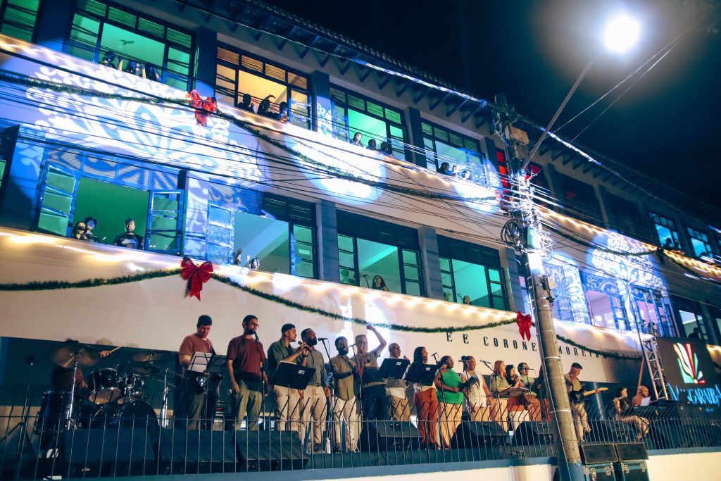 Encerrando a programação, o público foi presenteado com a Cantata Janelas Encantadas, que levou o verdadeiro espírito do Natal ao público presente. O espetáculo contou com um coral formado por alunos da rede municipal e convidados, que se apresentaram nas janelas da Escola Municipal Coronel Moreira da Silva, criando um cenário especial de luz e sensibilidade. A apresentação teve ainda a participação da Banda Marcial COMOSI e emocionou pais, responsáveis e toda a comunidade que acompanhou o evento.